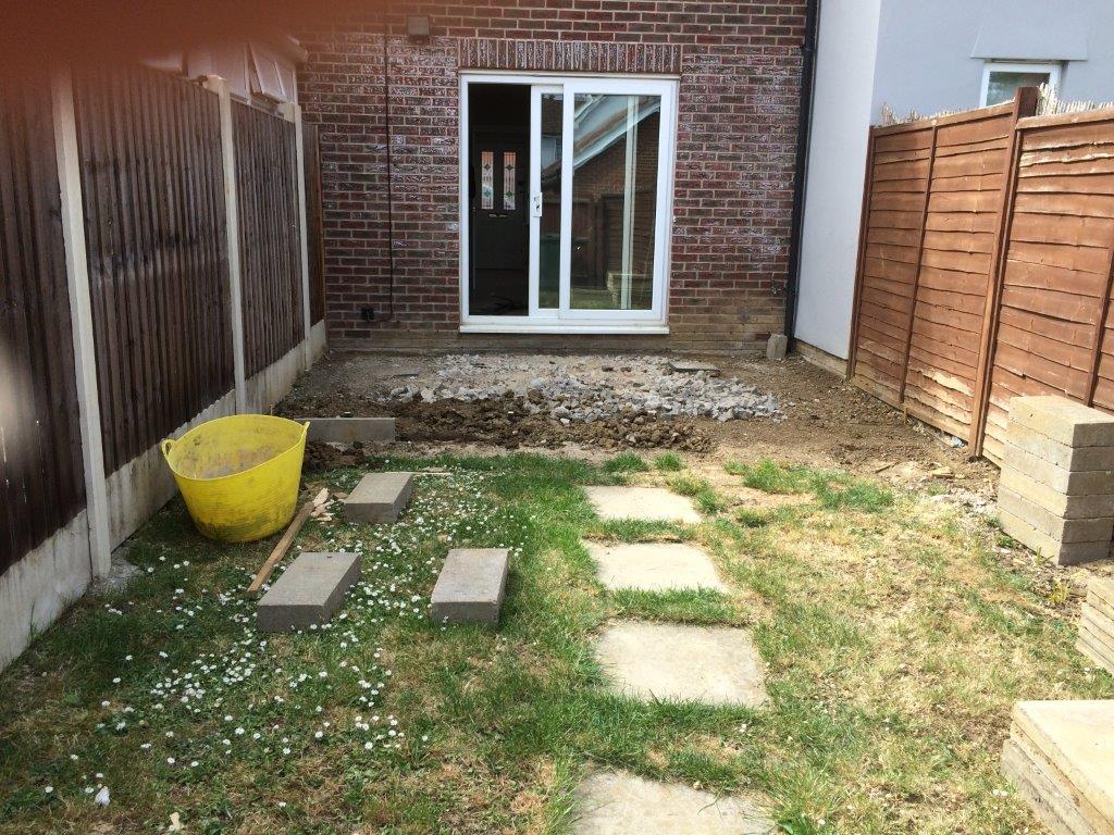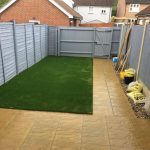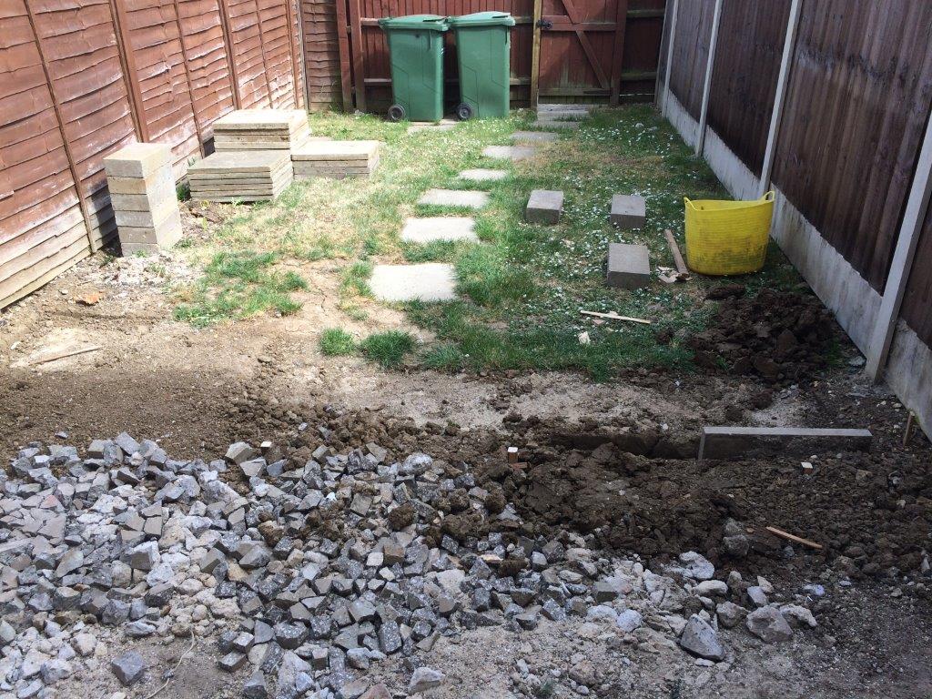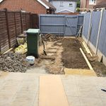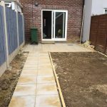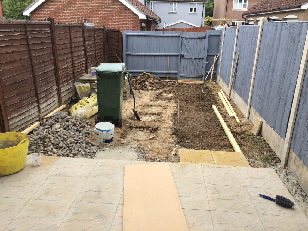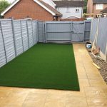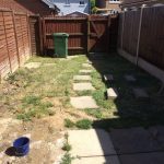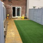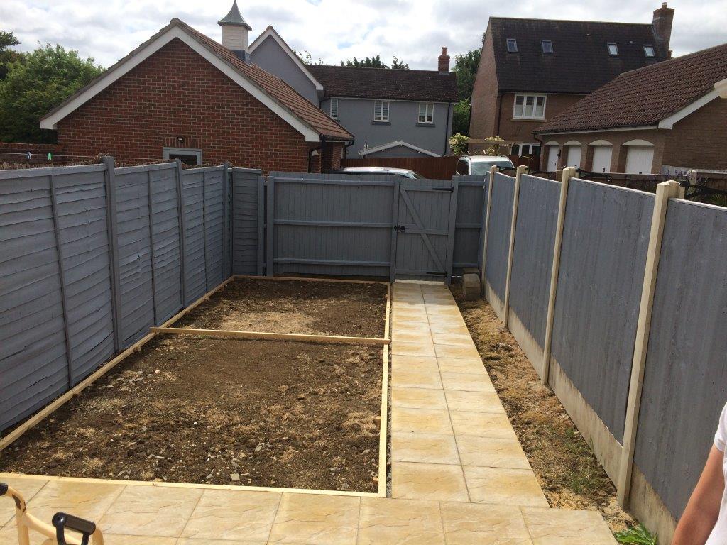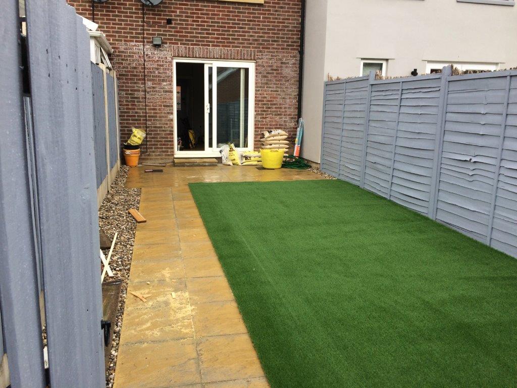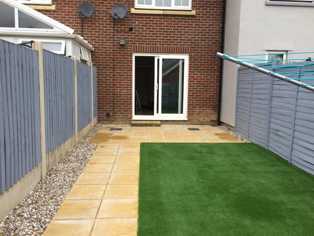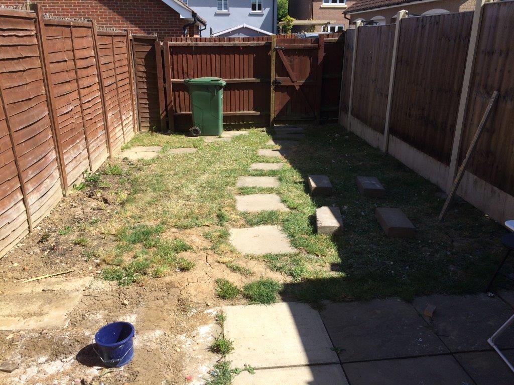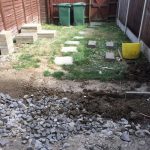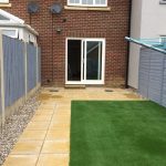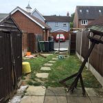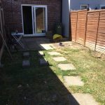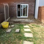 For this garden the old patio was lifted, a drain was added underneath an outside tap and the ground levelled prior to a new patio being laid. A step was added and the 2 manhole covers were lifted level with the patio. The rest of the garden was levelled, a broken fence post replaced and a path was laid. Astro turf was then laid and stones added to the edging.