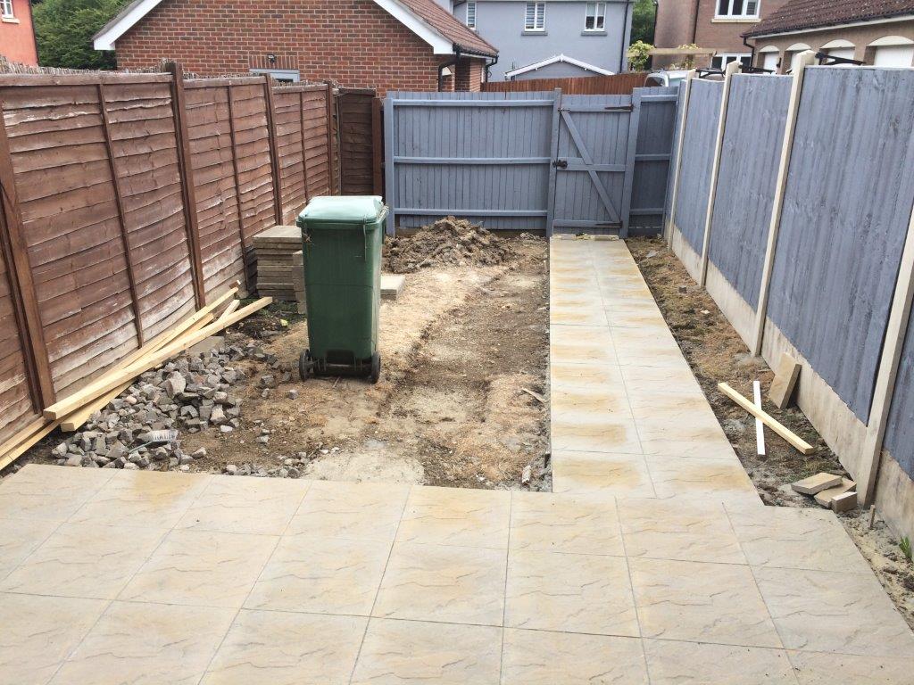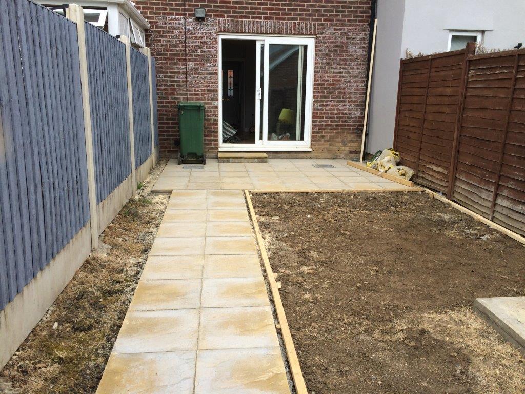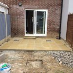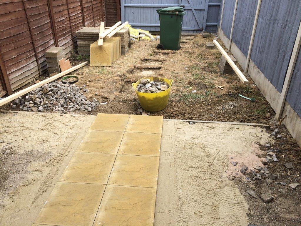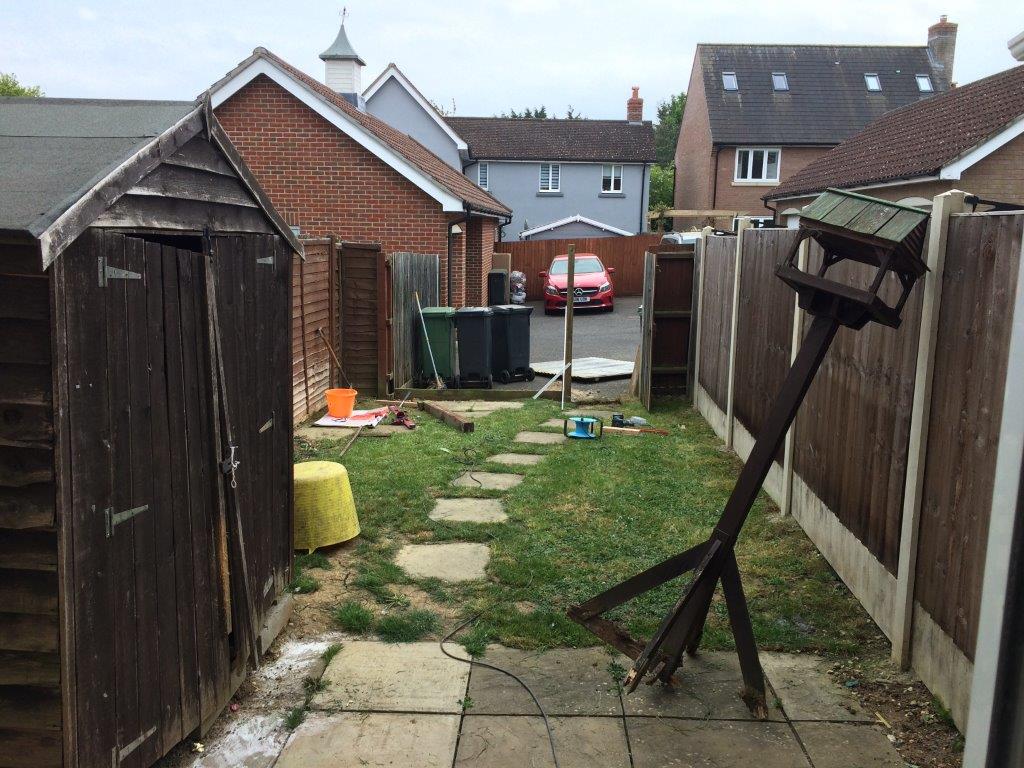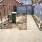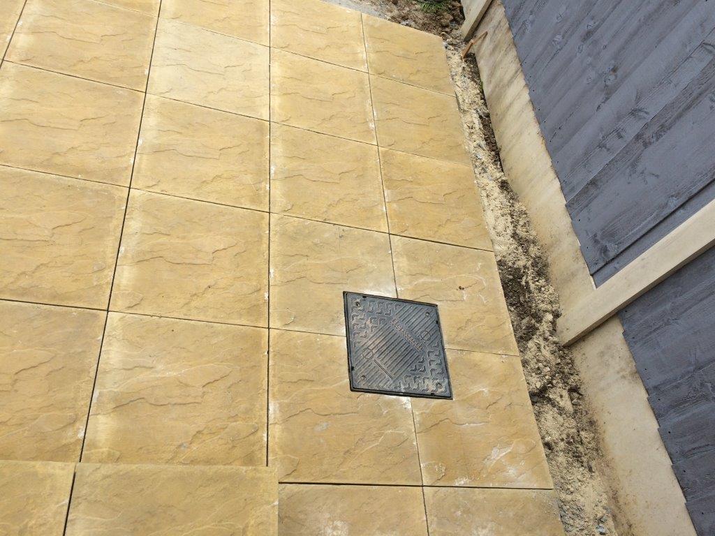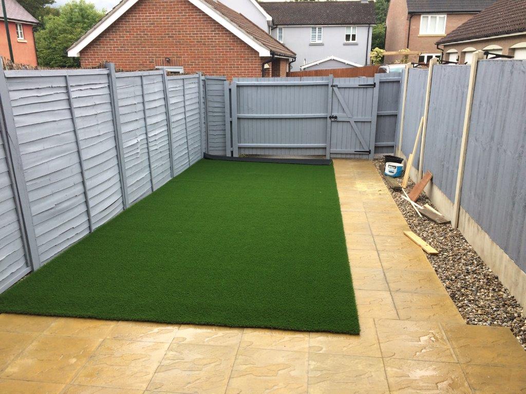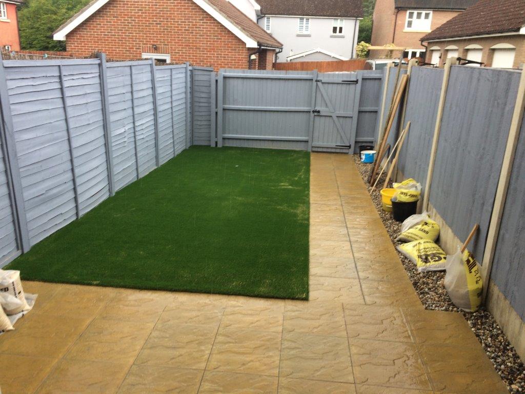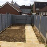 For this garden the old patio was lifted, a drain was added underneath an outside tap and the ground levelled prior to a new patio being laid. A step was added and the 2 manhole covers were lifted level with the patio. The rest of the garden was levelled, a broken fence post replaced and a path was laid. Astro turf was then laid and stones added to the edging.