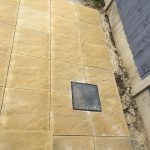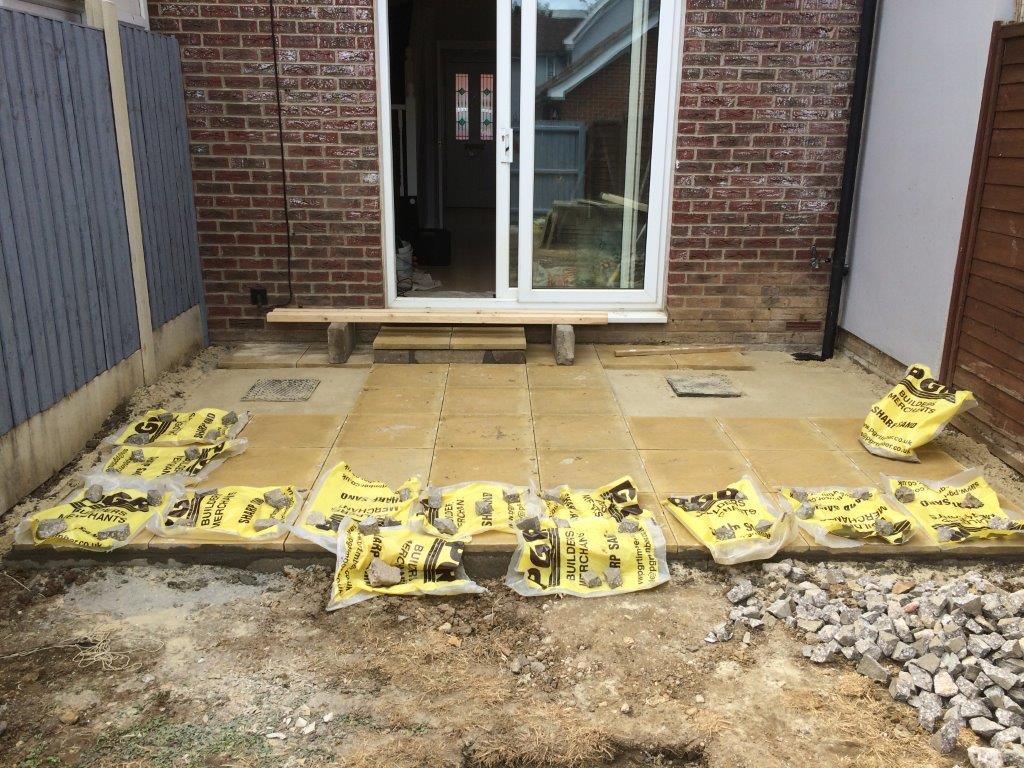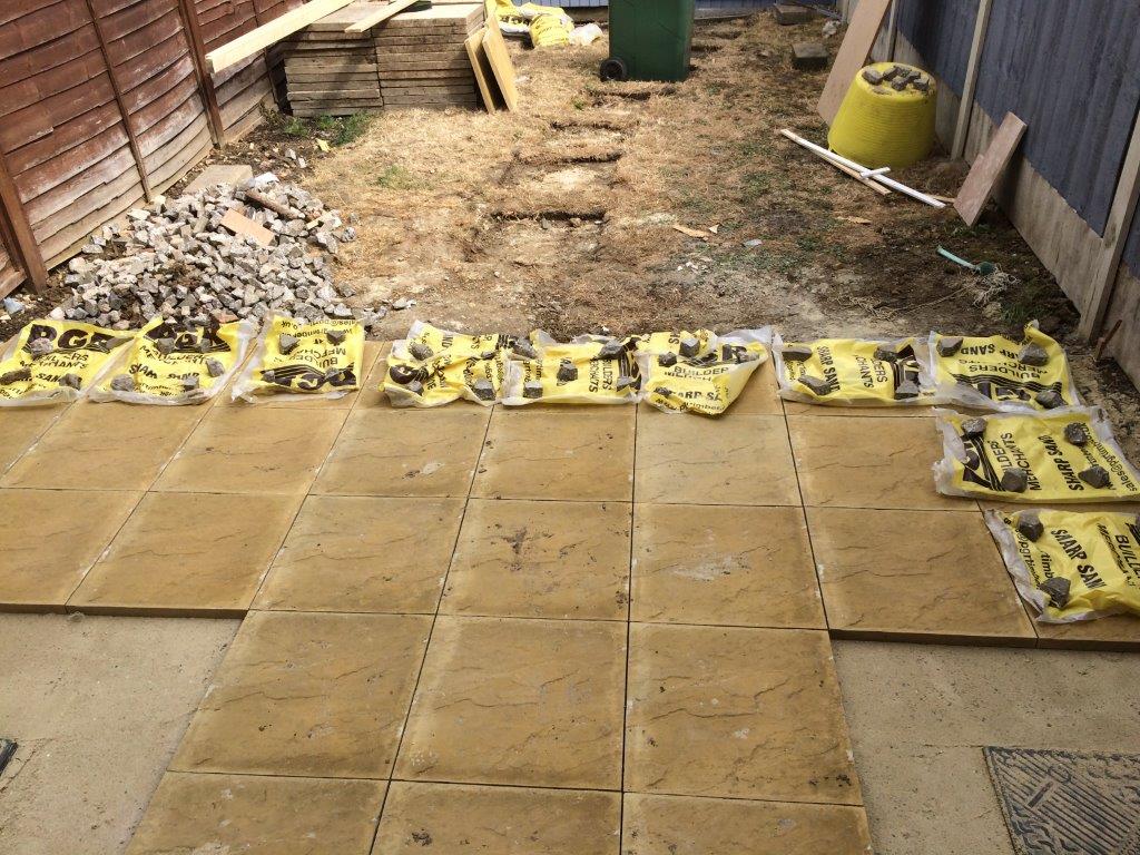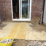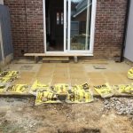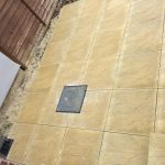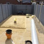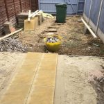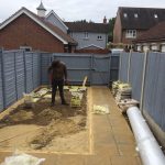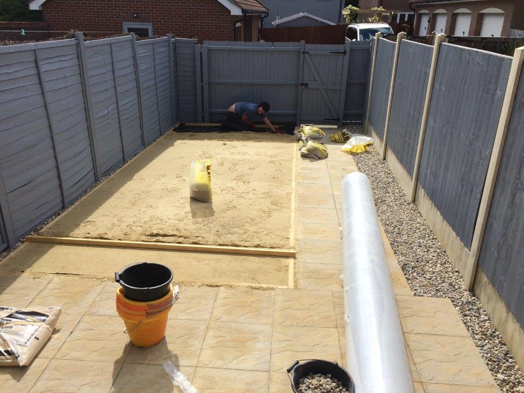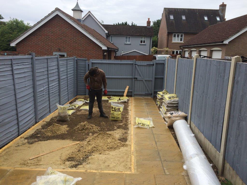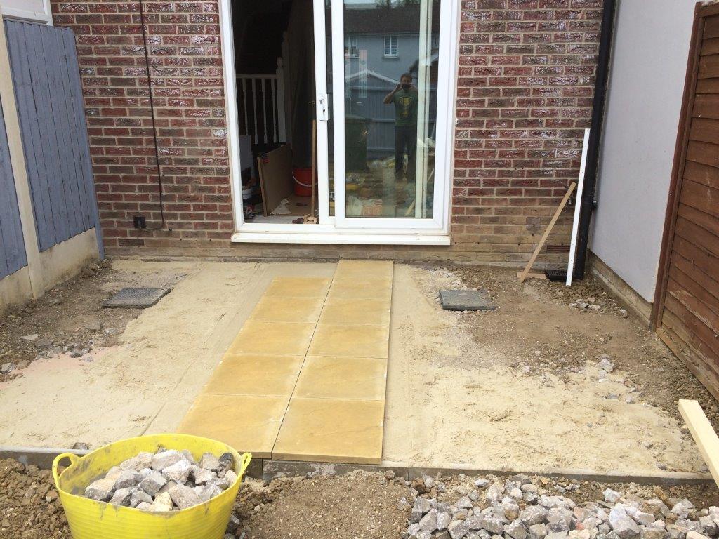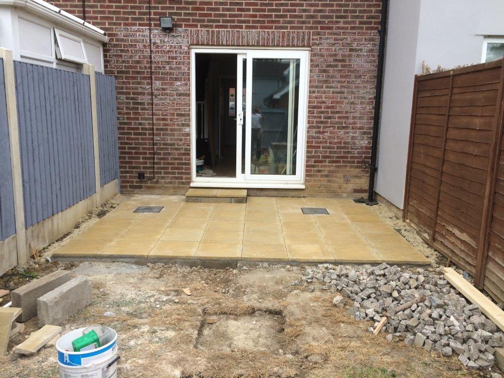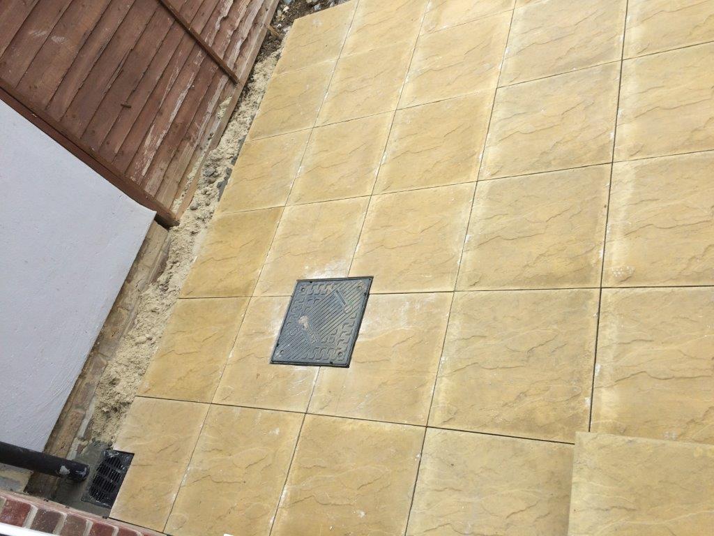 For this garden the old patio was lifted, a drain was added underneath an outside tap and the ground levelled prior to a new patio being laid. A step was added and the 2 manhole covers were lifted level with the patio. The rest of the garden was levelled, a broken fence post replaced and a path was laid. Astro turf was then laid and stones added to the edging.