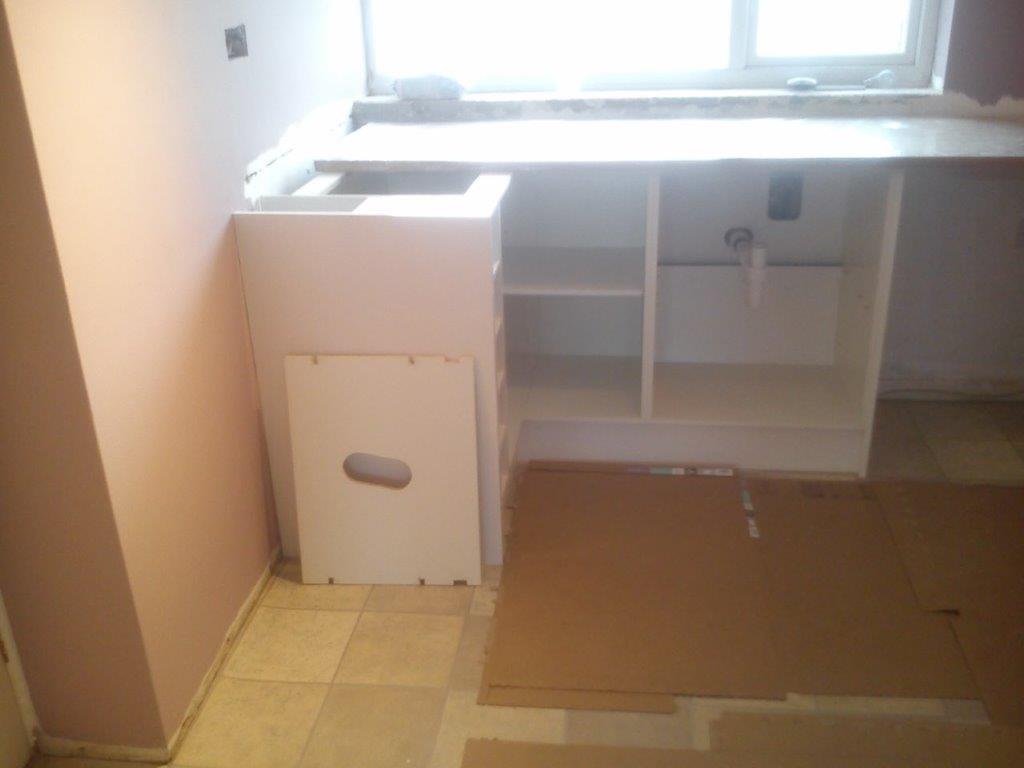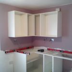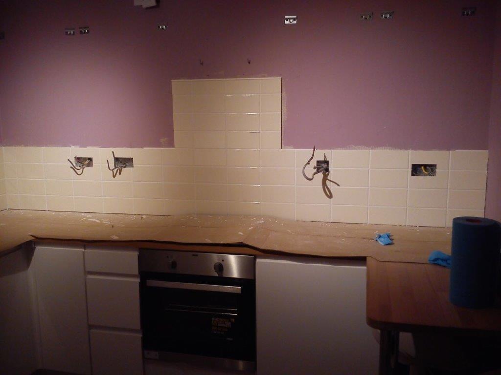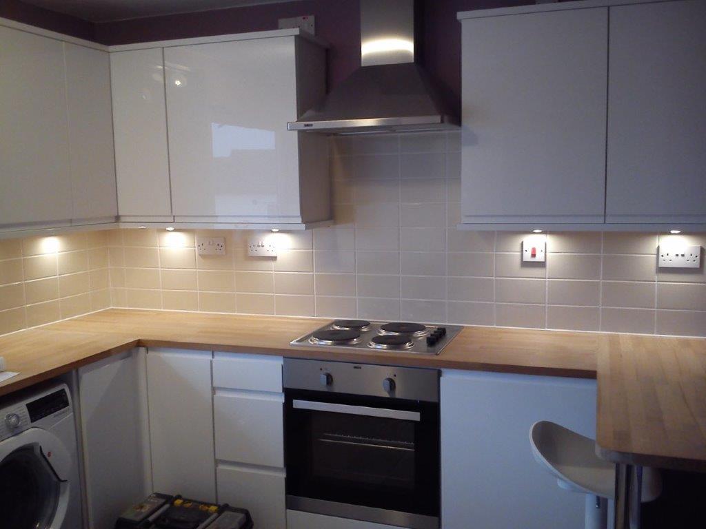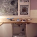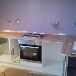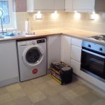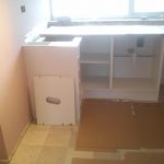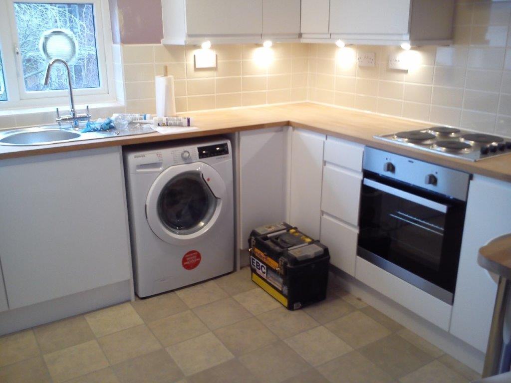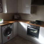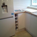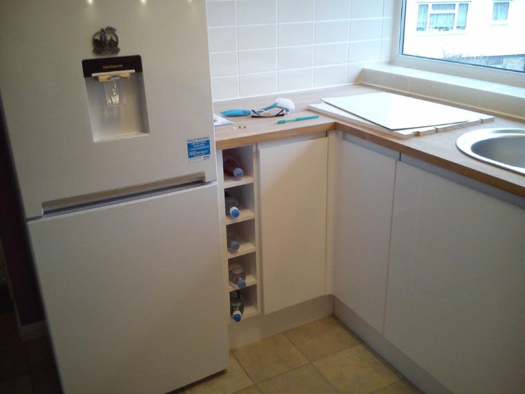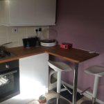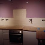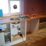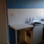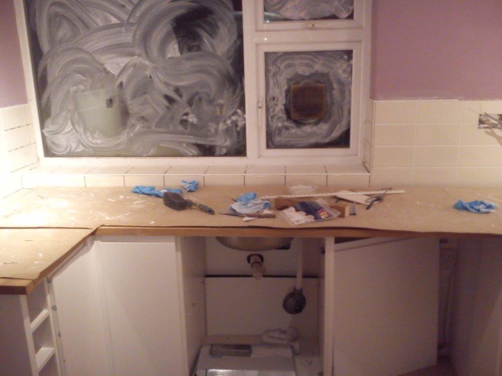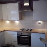 For this kitchen l had to remove the old worktops and units along with the wall tiles and floor covering and strip the flaking paintwork. New power points were added, dividing glass wall removed and replaced with stud wall and sliding door. Walls and ceiling were painted. New flooring laid and plumbing added for sink and washing machine. I fitted the units and tiled the walls, along with adding a cooker extraction hood and under unit lights. The worktops were fitted by a carpenter.
