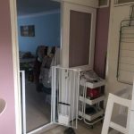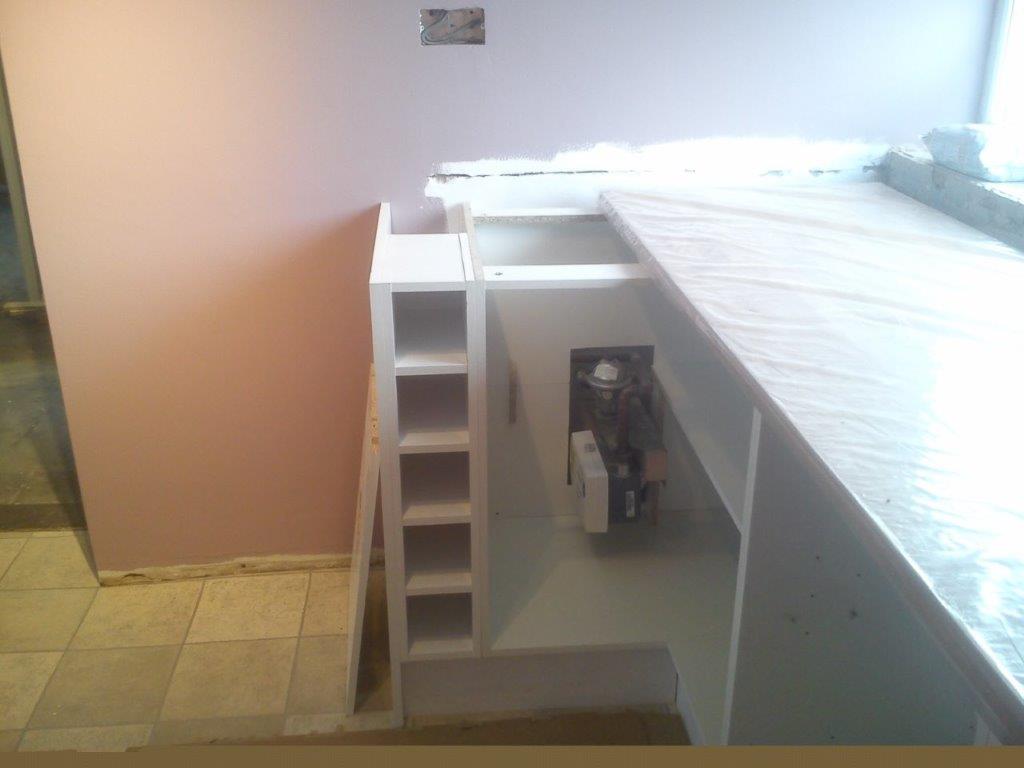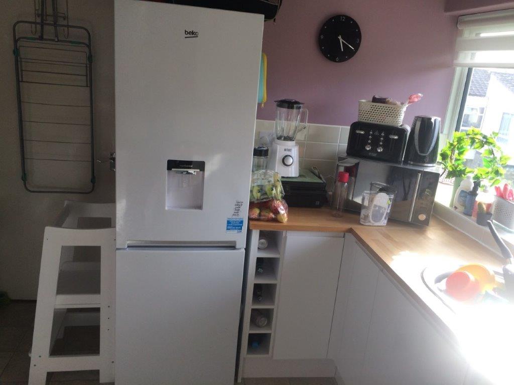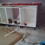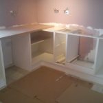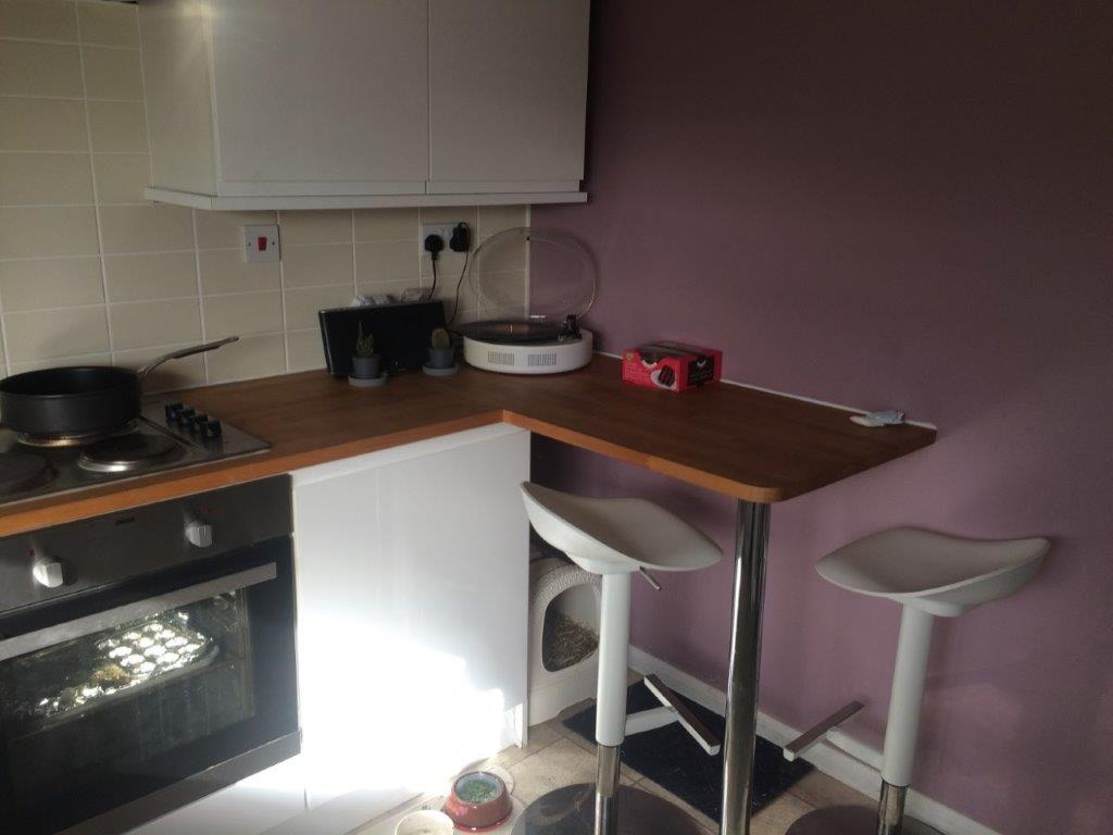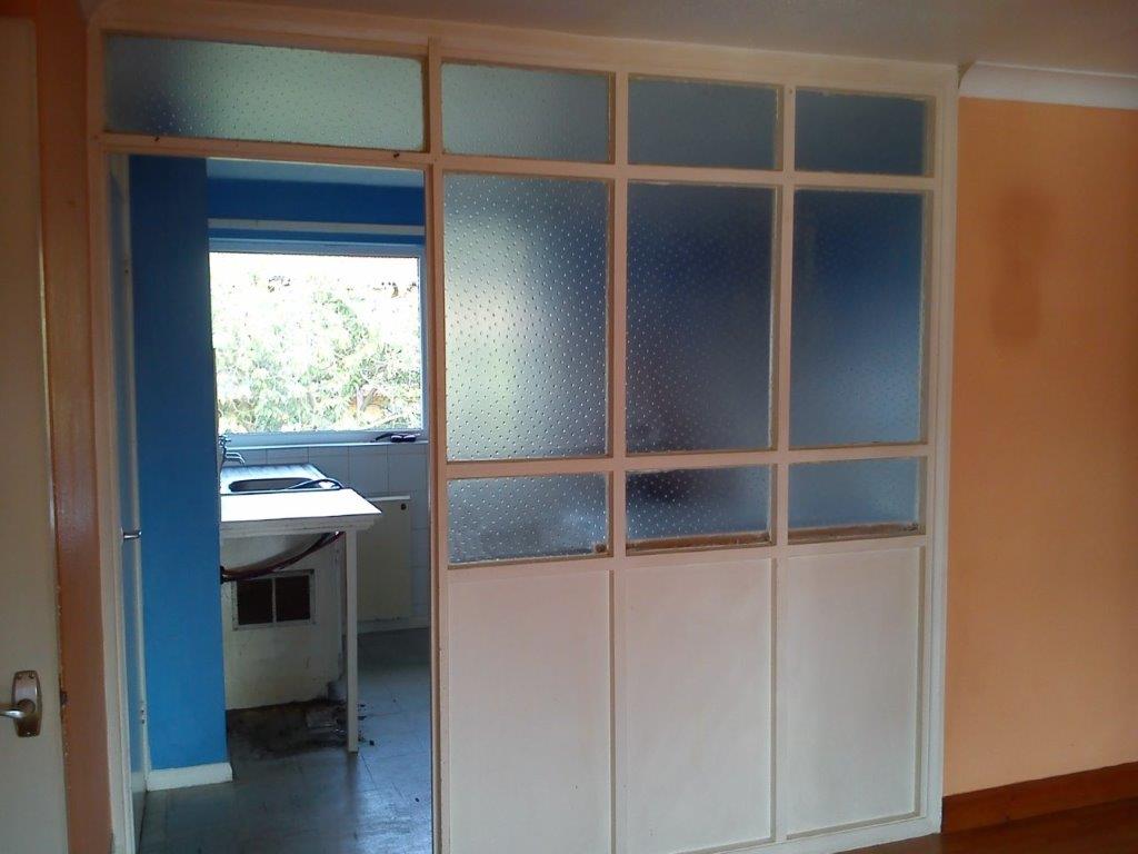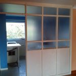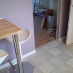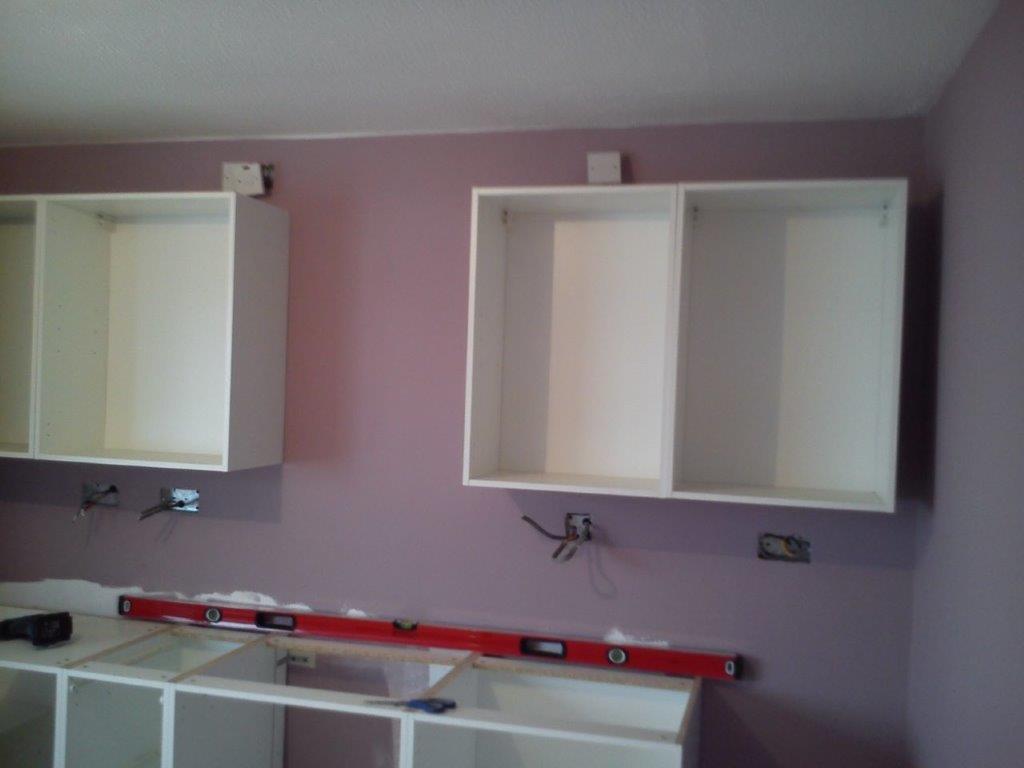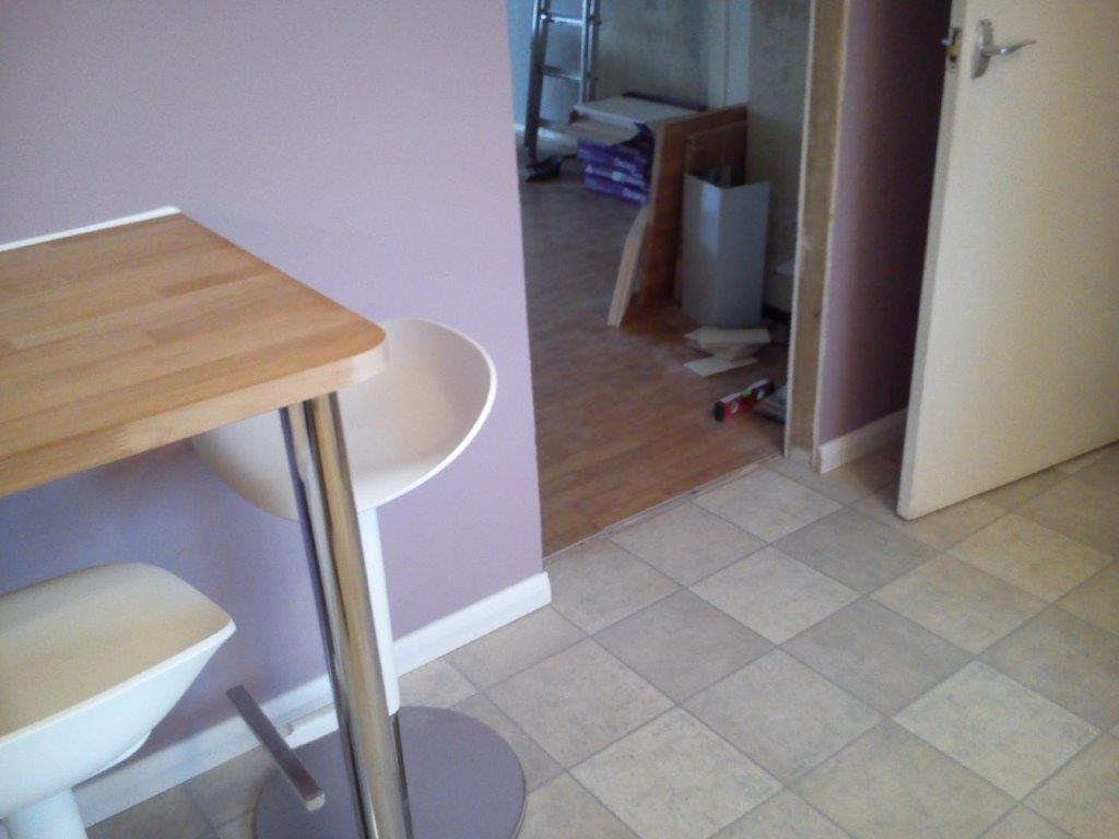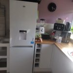 For this kitchen l had to remove the old worktops and units along with the wall tiles and floor covering and strip the flaking paintwork. New power points were added, dividing glass wall removed and replaced with stud wall and sliding door. Walls and ceiling were painted. New flooring laid and plumbing added for sink and washing machine. I fitted the units and tiled the walls, along with adding a cooker extraction hood and under unit lights. The worktops were fitted by a carpenter.